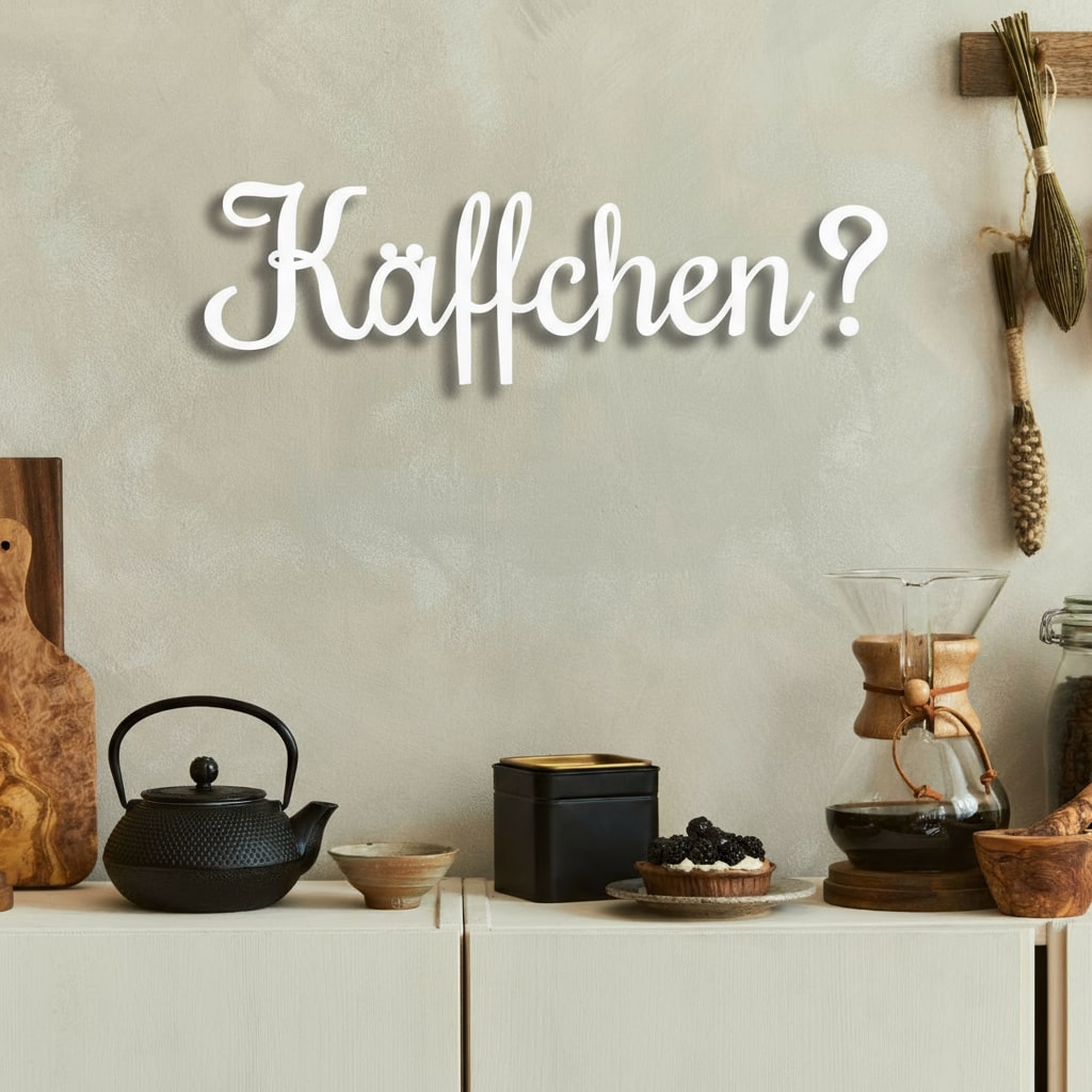 Unser "Käffchen"-Schriftzug zaubert eine gemütliche Kaffeepause in Ihren Raum. Dieses charmante Dekorationsstück verbreitet eine entspannte Atmosphäre und erinnert daran, dass eine Tasse Kaffee immer willkommen ist. Zeit für ein Käffchen!